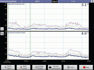 - Анализ тренда аЭЭГ за много дней, возможность просмотра отмеченных маркером клинических событий за любой период, позволяет просматривать необработанную ЭЭГ в любой временной точке длительной записи графически прослеживает количественные изменения в ЭЭГ измерениях, например амплитуде.