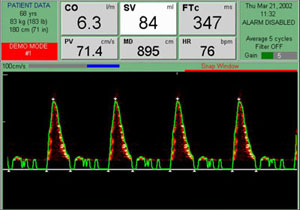 Работа монитора основана на принципе Допплера. Тонкий силиконовый датчик – зонд вводится в пищевод пациента на уровень V-VI грудного позвонка (на этом уровне аорта прилегает и проходит параллельно пищеводу). На конце датчика-зонда находится приемо-передатчик, непрерывно издающий ультразвуковую волну 4 МГц, и принимающий ультразвуковую волну, отражаемую от движущихся эритроцитов. Принимаемый сигнал обрабатывается монитором, и полученные результаты отображаются в графическом и цифровом виде на цветном дисплее. По умолчанию на дисплее монитора CardioQ отображаются шесть параметров: СО - сердечный выброс SV - ударный объем FТс - корригированное время потока РV - пиковая скорость МD - минутное расстояние HR - частота сердечных сокращений Также монитор высчитывает следующие параметры: SD - ударное расстояние FТр - время потока к пику МА - среднее ускорение СI - сердечный индекс SVI - индекс ударного объема Для получения следующих результатов необходимо вручную ввести дополнительные данные: SVR - системное сосудистое сопротивление SVRI - индекс системного сосудистого сопротивления DО2 - доставляемый кислород DО2I - индекс доставляемого кислорода Преимущества монитора CardioQ: